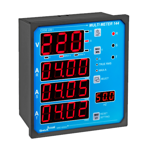 مولتی متر 144 شیوا امواج با نمایشگرهای دیجیتالی یزرگ جهت اندازه گیری و نمایش 6 پارامتر ولتاژ ، 6 پارامتر ماکزیمم ولتاژ و 6 پارامتر مینیمم ولتاژ، اندزه گیری و نمایش هم زمان 3 پارامتر جریان، 3پارامتر ماکزیمم جریان و همچنین اندازه گیری و نمایش فرکانس طراحی و ساخته شده است.با استفاده از این دستگاه می توان جریان های مورد نظر را به دو روش TRUE RMS و روش معمولی اندازه گیری و مشاهده نمود.